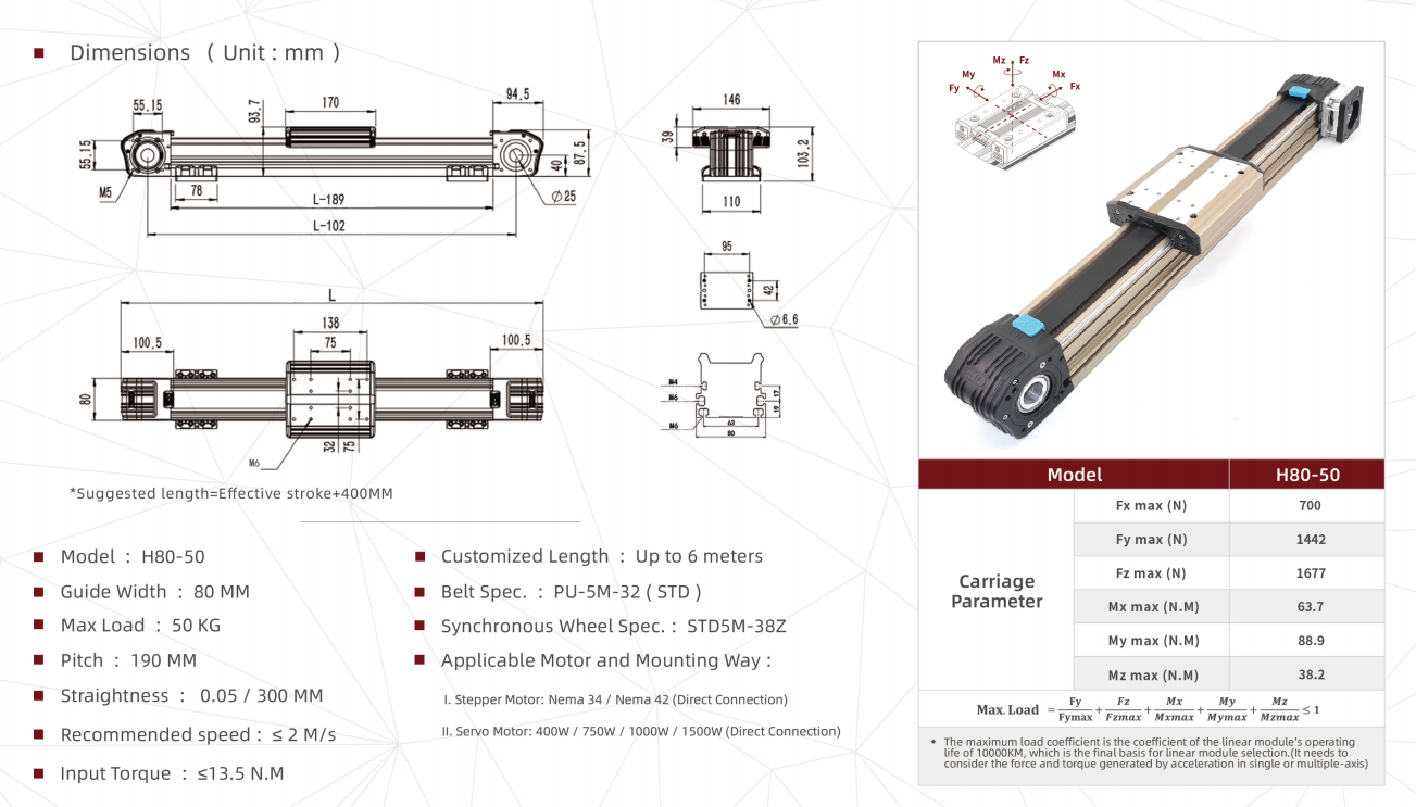 Customized length up to 6 meters, flexible motor position. Noiseless, smooth, self-cleaning sys. High positioning repeatability of 0.02mm, robust profile body, High rigidity and high anti-corrosion, ALL parts CNC processed, higher transmission efficiency of the coupler.