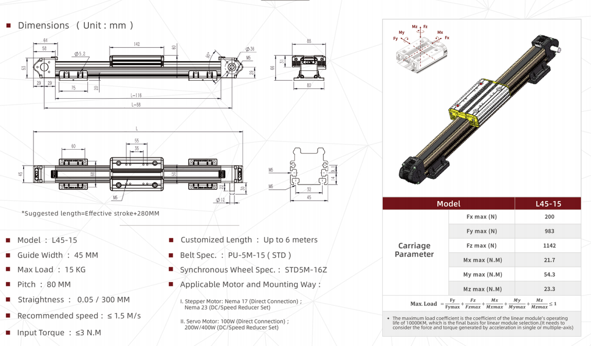 Customized length up to 6 meters, flexible motor position. Noiseless, smooth, self-cleaning sys. High positioning repeatability of 0.02mm, robust profile body, High rigidity and high anti-corrosion, ALL parts CNC processed, higher transmission efficiency of the coupler.