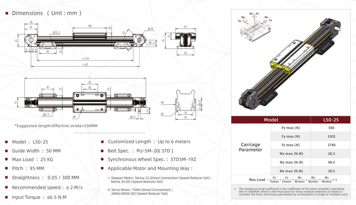 Customized length up to 6 meters, flexible motor position. Noiseless, smooth, self-cleaning sys. High positioning repeatability of 0.02mm, robust profile body, High rigidity and high anti-corrosion, ALL parts CNC processed, higher transmission efficiency of the coupler.